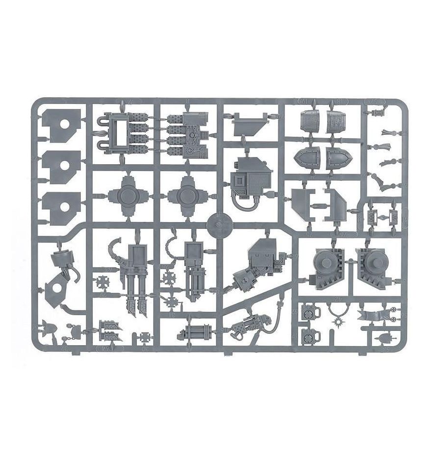 This box set contains one multi-part plastic Venerable Dreadnought. This 84-piece set includes: a plasma cannon, an assault cannon, lascannon, a heavy flamer, a storm bolter, two different power fists including an ornate one, and a set of smoke launchers. Also included are: two different sets of ornate leg guards, three different helmets, six purity seals, two different pennants, a range of different sarcophagus armour plates, several sarcophagus designs, and a host of Crux Terminatus and other Imperial icons.